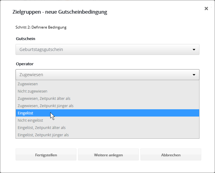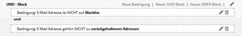 Insbesondere nach dem Kopieren einer vorhandenen Zielgruppe kann das sinnvoll sein, wenn die identischen Abonnenten in Original und Kopie nicht gewünscht sind. Bedingung anhand GutscheinFiltern Sie Abonnenten danach, ob und in welchem Zeitraum die Zuweisung oder Einlösung eines Gutscheins stattfand. Tipp: Um zugewiesene Gutscheine als eingelöst zu markieren, nutzen Sie entweder die Webservice-Funktion 'RedeemVoucherByCode' oder importieren in der Gutscheinübersicht eine CSV-Datei mit den eingelösten Gutscheincodes. Bedingung anhand SelektionMit diesem Bedingungstyp nutzen Sie eine per Webservice angelegte Selektion von Abonnenten als EOS Newslettertool-Zielgruppe. Der Bedingungstyp ist nur dann sichtbar, wenn per Webservice mindestens eine Selektion angelegt wurde. Das Besondere: In einer Selektion werden Abonnenten anhand einer Liste von IDs gruppiert. So lässt sich eine extern getroffene Abonnentenauswahl als Zielgruppe nutzen, ohne dass in den EOS Newslettertool-Abonnentendaten ein gemeinsames Merkmal vorliegen muss. Die Details entnehmen Sie bitte der Webservice-Dokumentation, die wir Ihnen gern zusenden. Bedingung anhand des Empfängers (geplant)Diese Bedingung entscheidet, ob ein Abonnent als Empfänger eines bestimmten Mailings vorgesehen war oder nicht. Das bedeutet, dass er in einer Abonnentenliste bzw. Zielgruppe für ein bestimmtes Mailing steht, welches versandt wurde. Im Unterschied zur letztgenannten Bedingung wird der tatsächliche Empfang jedoch nicht geprüft. Es sind auch alle Empfänger enthalten, die das Mailing z. B. aufgrund von Bounces, Blacklists oder serversseitigen Spamfiltern nicht empfangen haben. Bedingung anhand des Empfangens (zugestellt)Diese Bedingung entscheidet, ob jemand ein bestimmtes Mailing empfangen hat oder nicht. Das Mailing gilt als empfangen, wenn der E-Mail-Server des Abonnenten eine positive Rückmeldung erteilt hat. Im Schritt nach dem Empfang ist es dennoch möglich, dass das Mailing beim Empfänger in einem Spamordner landet. Bedingung anhand des BounceverhaltensDamit legen Sie Bedingungen anhand der Zustellungen oder Nichtzustellungen eines bestimmten Mailings an. Bedingung anhand Blacklist bzw. Zurückgehaltener AdressenAbonnenten, deren E-Mail-Adresse auf einer Blacklist oder der Liste der zurückgehaltenen Adressen steht, werden automatisch vom Versand ausgeschlossen. Dieselben* Abonnenten lassen sich per Zielgruppe filtern, etwa um sie beim Export Ihrer Abonnentendaten ebenfalls auszuschließen. Die kombinierte Zielgruppe sieht wie folgt aus: