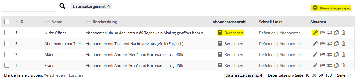 Per Klick auf das kleine Taschenrechner-Symbol berechnen Sie die Abonnenten-Anzahl der Zielgruppe für alle Abonnentenlisten. Mit Klick auf 'Abonnenten' in der Spalte 'Schnell-Links' sehen Sie, welche Abonnenten zur Zielgruppe gehören. Wenn Sie die Berechnung auf bestimmte Abonnentenlisten beschränken möchten, klicken Sie auf das Bearbeiten-Symbol. Auf dem Reiter 'Berechnung' markieren Sie nun gewünschten Abonnentenlisten. Selbstverständlich können Sie auch direkt in der Zielgruppe eine bestimmte Listenzugehörigkeit definieren. Neue Zielgruppe anlegenKlicken Sie oben rechts auf 'Neue Zielgruppe' und geben Sie den Namen und (optional) eine Beschreibung der Zielgruppe ein. Wechseln Sie anschließend zum Reiter 'Definition'. Reiter 'Definition'Hier erstellen Sie die Bedingungen Ihrer Zielgruppe, z. B. Anrede = "Herr". Klicken Sie oben rechts auf 'Neue Bedingung' und wählen Sie einen der folgenden Bedingungstypen: