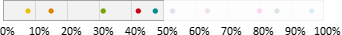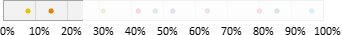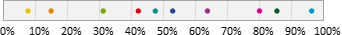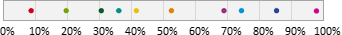 Auswahl-Wahrscheinlichkeit in ProzentGeben Sie einen Prozentwert zwischen 0 und 100% ein. Mit dieser Wahrscheinlichkeit gehört ein Abonnent zur Zielgruppe. Beispielsweise bewirkt ein Wert von 25%, dass ungefähr (siehe Hinweis) ein Viertel aller Abonnenten zur Zielgruppe gehören. Dazu verteilt EOS Newslettertool alle Abonnenten auf einem Zahlenstrahl zwischen 0 und 100%. Bei 10 "bunten" Abonnenten könnte eine Variante so aussehen: