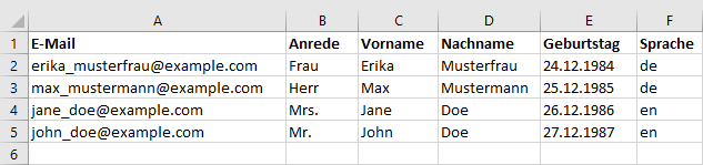 Abonnenten: ImportWahrscheinlich haben Sie bereits eine Liste von Adressen zusammengestellt, die Sie per Newsletter anschreiben möchten. Über das universelle CSV-Dateiformat lassen sich Ihre Adressen aus nahezu jeder Datenbank oder Tabellenkalkulation (z. B. Microsoft Office oder Open Office) exportieren und anschließend in EOS Newslettertool importieren. Um die Zuordnung der Spalten (z. B. Vorname, Nachname, E-Mail) beim Import zu erleichtern, sollte die erste Zeile Ihrer CSV-Datei aussagekräftige Spaltenüberschriftten enthalten. Ein Beispiel: