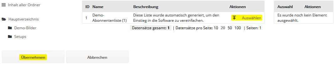 Schritt 3 - AbonnentenlistenWählen Sie nun aus, in welche EOS Newslettertool Abonnentenliste ihre CSV-Datei importiert werden soll. Falls Sie zuvor keine eigene Abonnentenliste in EOS Newslettertool angelegt haben (siehe Menü Abonnentenlisten), steht zum schnellen Einstieg die leere Abonnentenliste 'Demo-Liste' bereit. Diese Liste wird in der Regel bei der Einrichtung Ihres EOS Newslettertool Kontos angelegt und zur Demonstration mit einem Beispiel-Abonnenten befüllt.
