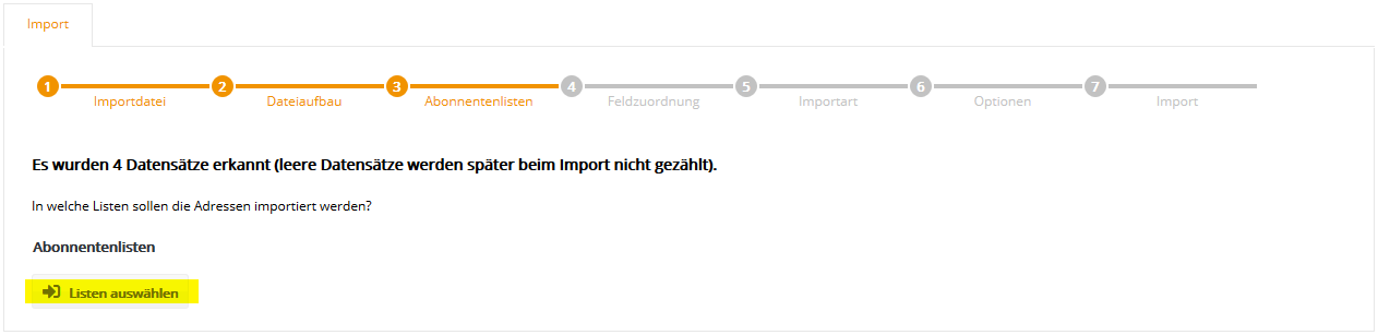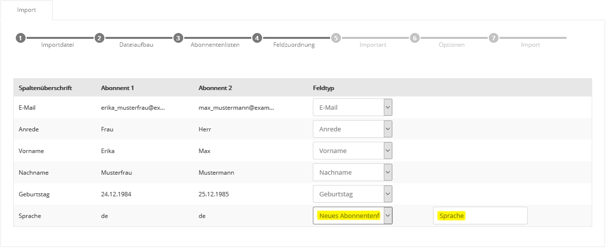Auch die Auswahl mehrerer Abonnentenlisten ist möglich, falls Sie parallel in mehrere Listen importieren möchten. Klicken Sie nach Auswahl der gewünschten Liste(n) auf 'Übernehmen' und anschließend auf 'Weiter'. Der Name einer Abonnentenliste lässt sich im Menü Abonnentenlisten auch nachträglich jederzeit ändern. Schritt 4 - FeldzuordnungIn Schritt 4 teilen Sie EOS Newslettertool mit, welche Spalte (z.B. Vorname, Nachname) Ihrer CSV-Datei in welches EOS Newslettertool Abonnentenfeld importiert werden soll. Zum schnellen Einstieg sind typische Abonnentenfelder wie 'E-Mail', 'Anrede', 'Vorname' und 'Nachname' in EOS Newslettertool bereits vorhanden.