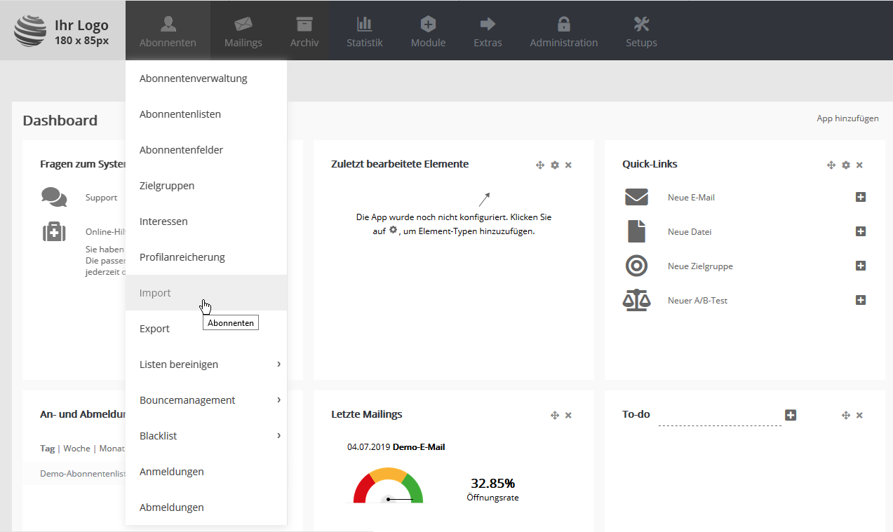 Zum Abspeichern Ihrer Daten wählen Sie bitte je nach Version Ihres Office-Paketes das Exportformat CSV UTF8 (Trennzeichen-getrennt) oder CSV (Trennzeichen-getrennt). Import Schritt für Schritt erklärtUm Ihre CSV-Datei in EOS Newslettertool zu importieren, wählen Sie im Menü 'Abonnenten' den Punkt 'Import':