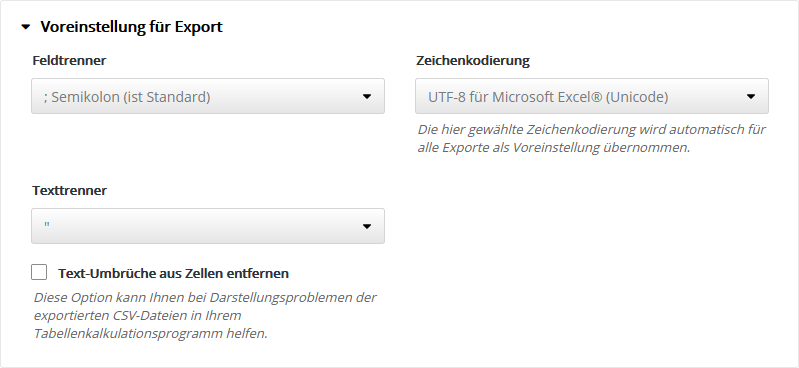 Folgende 'HTML-Editoren' sind in EOS Newslettertool integriert und nutzbar: Grundeinstellung ExportHier legen Sie die Voreinstellung für den Export von CSV-Dateien fest, z. B. für den Export von Abonnentendaten. Bei der Durchführung jedes Exportes können Sie bei Bedarf auch eine abweichende Einstellung wählen. Standardeinstellung ist die Option 'UTF-8 für Microsoft Excel® (Unicode)', technisch gesprochen 'UTF-8 mit BOM'. Dieses Format wird von den meisten Officeanwendungen automatisch erkannt, so dass Umlaute und Sonderzeichen ohne manuelle Formatwahl korrekt importiert werden. StatistikeinstellungenTragen Sie Ihre eigenen Maximalwerte ein, um die rot|gelb|grün Farb-Umschaltung der Statistik-Anzeige für Öffungsrate, Klickrate und Bouncerate an die typischen Werte Ihrer Mailings anzupassen. Nur Ihre besten Mailings sollten den grünen Bereich erreichen. Die Farb-Umschaltung erfolgt automatisch in Drittel-Stufen des eingetragenen Maximalwertes. Empfehlung: Notieren Sie aus der Statistik Ihrer bisherigen Mailings die Durchschnittswerte für Öffnungsrate, Klickrate und Bounces. Damit dieser Durchschnittswert zukünftig im mittleren Drittel der Skala landet, tragen Sie das Doppelte dieses Wertes als Maximum in das jeweilige Feld ein. Tragen Sie z. B. 30% als Maximum ein, dann werden anschließend die Werte bis 10% rot, bis 20% gelb und darüberliegende Werte grün gefärbt. Sie sehen sofort, ob Ihr aktuelles Mailing über- oder unterdurchschnittlich abschneidet. Typische Durchschnittswerte: