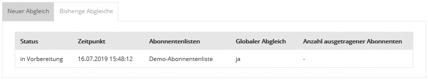 Daraufhin startet EOS Newslettertool den Abgleich. Im Reiter 'bisherige Abgleiche' können Sie den Status des Fortschrittes einsehen. Nach Fertigstellung wird Ihnen die Anzahl der ausgetragenen Abonnenten angezeigt. |