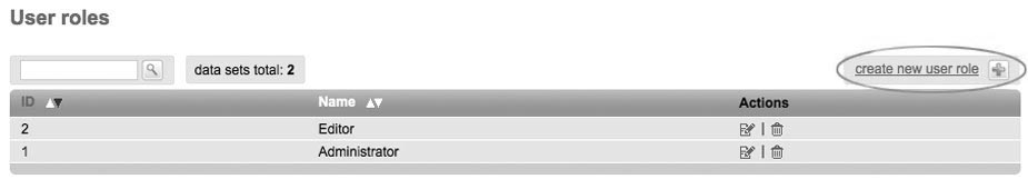 Administrate rights for your users through 'user roles' in 'EOS Newslettertool'. All your already existing users are listed in a clear table. You can edit an user role by clicking the icons of editing or deleting. |