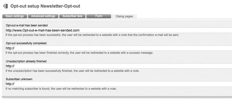 Enter a name and an optional description. Choose the 'mode' (important). The following modes are supported by 'EOS Newslettertool': Double-optout with confirmation e-mail: after unsubscribe from your website or your newsletter a confirmation email will be send automatically. Optout will be activated after clicking the confirmation link in this email. After successful unsubscription the former subscriber will get a last email („You unsubscribed successfully of our newsletter.“) Double Optout: Like described before, but without sending of a „successful unsubscription“ e-mail Confirmed Opt-Out (recommended): After unsubsubscription on your website or in your newsletter a „successful unsubscription“ email will be sended immediately. Single Optout: No e-mails will be send. There just will be a message in your browser, that optout was successfull. In Tab 'advanced settings' you can deposit your e-mail address in field 'e-mail forwarding', to be informed about unsubscriptions. Tab 'subscriberlists': Choose your favorite subscriberlist(s), where all unsubscriptions should be logged out. Select the subscriberfields, which should be filled out by your subscribers in tab 'Form'. After clicking 'create form fields' a popup appears, where you can choose and add subscriber fields to your form. Click 'sort formular fields' to arrange your fields. Click 'test form' to open a new tab in your browser with a preview of your form. Source Code of your website is genereated by 'EOS Newslettertool' by clicking 'Formular soruce code'. A popup appears with your source code. Last tab: Dialog pages |