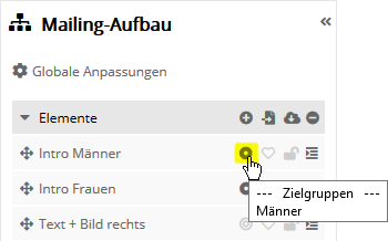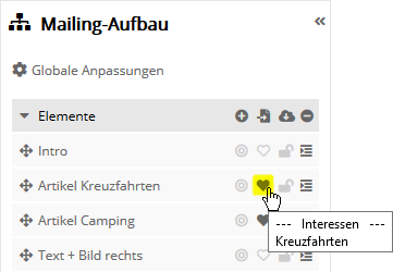 Inhalte bearbeiten: Daten eingebenIn der Detailansicht eines Elements fügen Sie Ihre konkreten Inhalte ein, d. h. Texte, Bilder und Links. Für kleine Änderungen können Sie die Texte und Links auch direkt in der Mailing-Entwurf-Oberfläche bearbeiten. Die Bearbeitung von Elementen in der Detailansicht ist jedoch bei größeren Anpassungen komfortabler und bietet mehr Einstellmöglichkeiten. In der Detail-Ansicht finden Sie neben dem Reiter 'Allgemein' auch die Reiter 'Zielgruppen' und 'Interessen'. Diese erreichen Sie aus der Mailing-Entwurf-Oberfläche durch Klick auf das Zielgruppen-Artikel-Symbol (Kreis) und das Symbol Interessen-Sortierung.