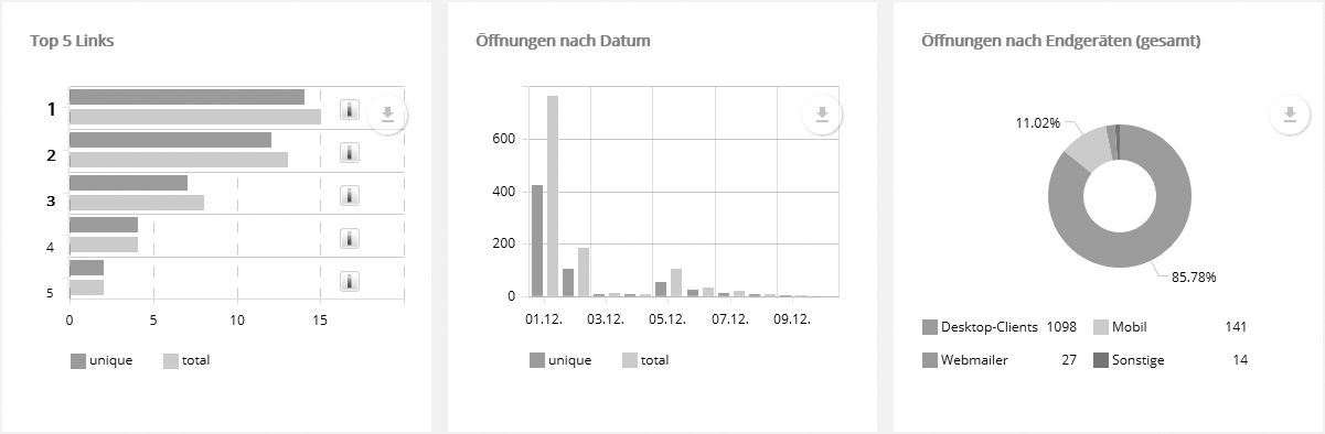 Per Klick auf 'Vollbild' wird die Karte im gesamten Fenster dargestellt. Direkt unter dem Vollbild-Link können Sie per Download-Button die Grafik der Karte in verschiedenen Formaten herunterladen. Hinweis: Obwohl IP-Adressen grundsätzlich nicht an einen bestimmten Ort gebunden sind, lässt sich durch die bekannten IP Adressräume von Internetprovidern, Universitäten und ähnlichen Einrichtungen in vielen Fällen der Standort ermitteln. Da regionale Einwahlknoten häufig einen festen IP-Adresspool besitzen, funktioniert das Verfahren auch bei dynamischer IP-Vergabe. Für die Zuordnung nutzt EOS Newslettertool eine regelmäßig aktualisierte lokale Kopie einer Geotargeting-Datenbank, die ein externer Dienstleister zur Verfügung stellt. --> Top 5 Links + Öffnungen nach Datum und EndgerätenWie bei jedem anderen Diagramm lassen sich auch hier per Download-Button (rechte obere Ecke) die angezeigten Daten als Grafik- oder Excel-Datei herunterladen. Einzelne Diagramm-Segmente lassen sich ein- oder ausblenden, indem man auf den entsprechenden Punkt in der Legende klickt, z.B. auf 'Desktop-Clients' im Diagramm 'Öffnungen nach Endgeräten'. Damit werden die übrigen Segmente auf 360° gezoomt und deren Prozentzahlen passen sich der neuen Anordnung an. So lässt sich das Verhältnis beliebiger Segmente direkt vergleichen.