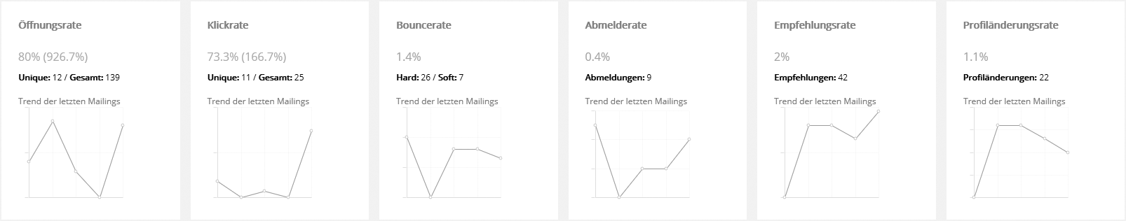 --> Trends der letzten MailingsHier wird für verschiedene Kenngrößen der Trend der zuletzt versendeten Mailings angezeigt.