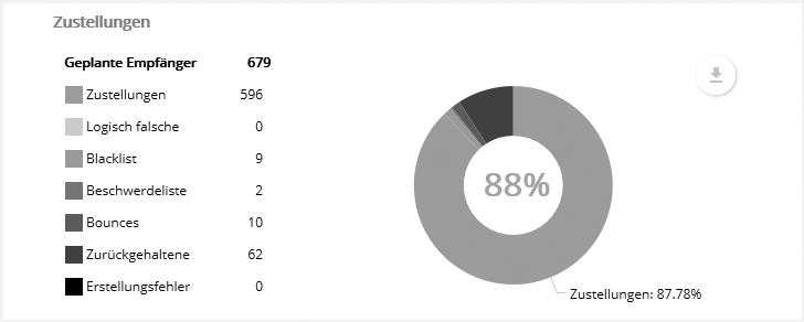 In der Mitte des Kreisdiagramms sehen Sie die Zustellrate Ihres Mailings. Damit ist der Anteil der tatsächlich versendeten Mailings gegenüber der geplanten Empfängerzahl gemeint: